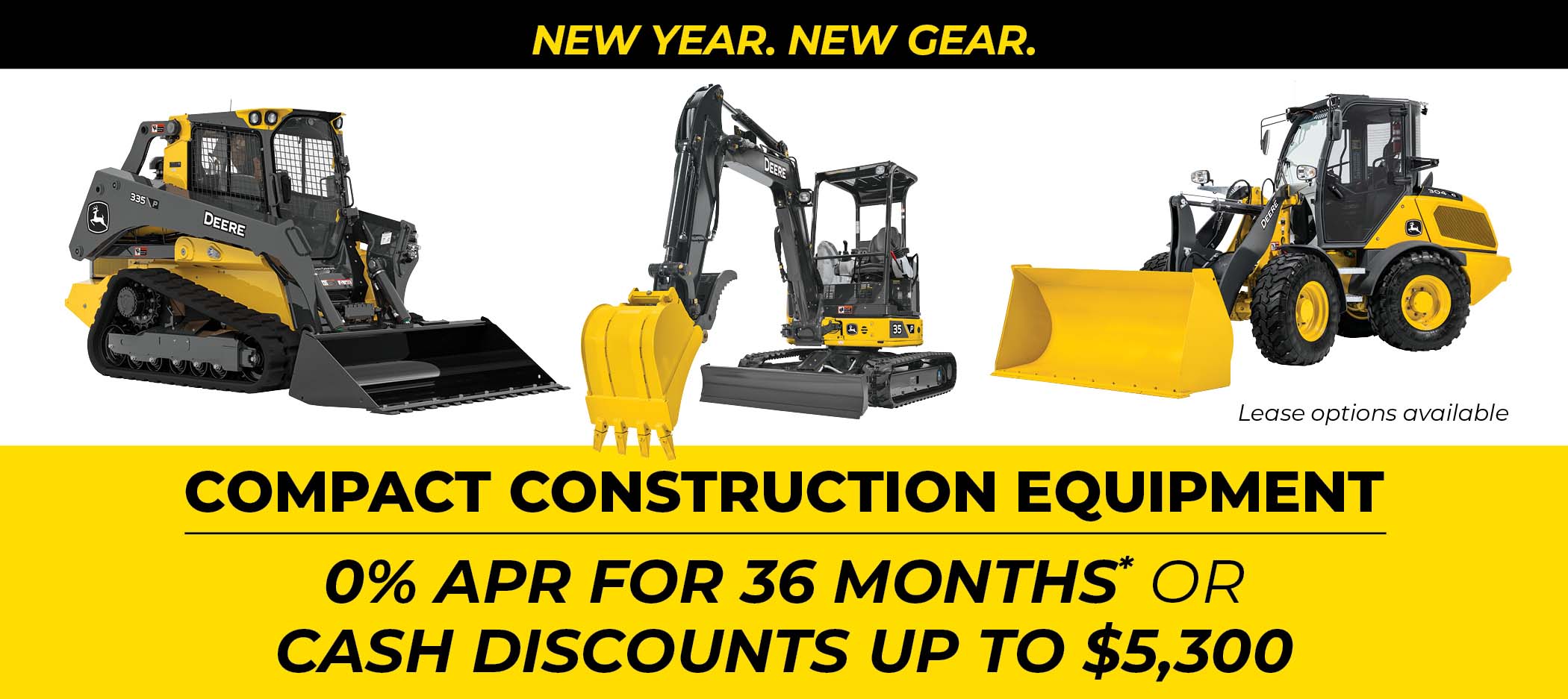 *Offer valid on qualifying John Deere compact construction equipment financed through John Deere Financial at 0% APR for 36 months with payment waiver. Finance and cash bonus program expires February 28, 2026; bonus amounts vary by model and will be reduced after that date. Subject to approved credit. Taxes, fees, and insurance may increase payment amount. Some restrictions apply; see dealer for complete details.