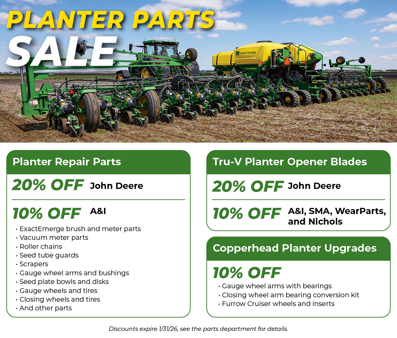 Save up to 20% on select Planter Parts and get your equipment ready for success in the field!Includes Planter repair parts, Tru-V Planter Opener Blades & Copperhead Planter Upgrades.