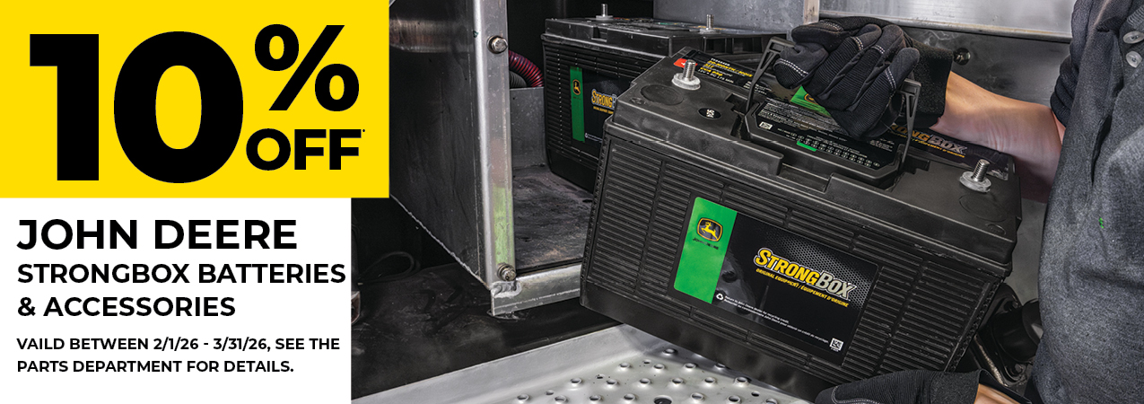 Get your day off to a great start with StrongBox™ batteries from John Deere. Original Equipment and Standard-Duty batteries are manufactured to perform in all types of weather from bitter cold to sweltering heat. And now through March 31, 2026, you can get 10% OFF*
