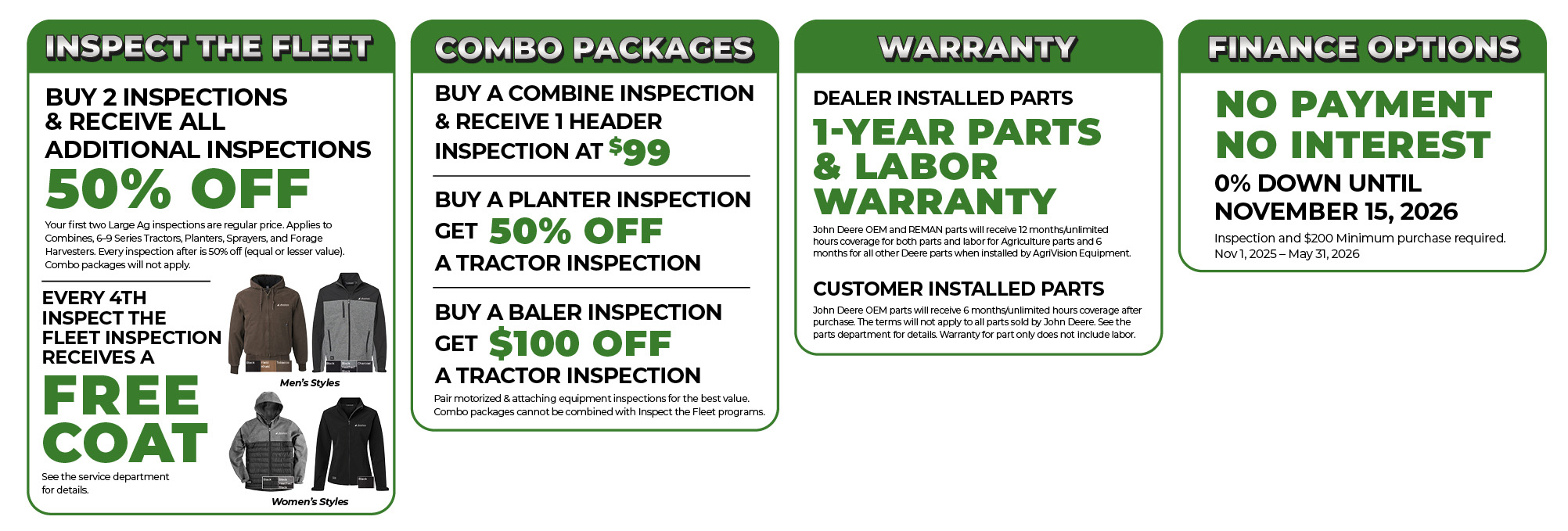 Every inspection is carried out by a certified AGRIVISION EQUIPMENT technician, and based on their expert recommendations, we’ll create a customized plan tailored to both your equipment and budget. As part of our commitment to delivering top-notch service, we offer 12 months/unlimited hours coverage on John Deere, A&I, and Reman parts when installed by one of our certified technicians.