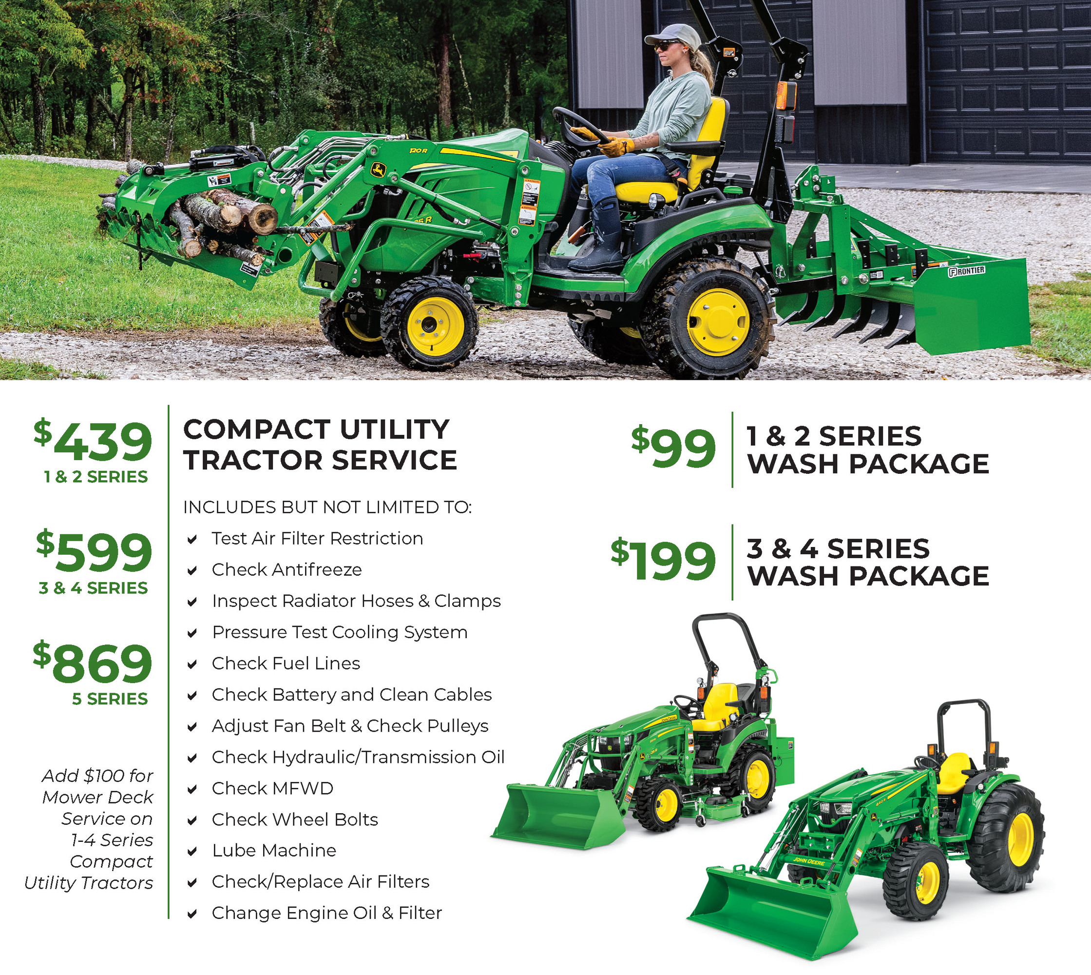 We service a full lineup of John Deere compact utility tractors or other colors